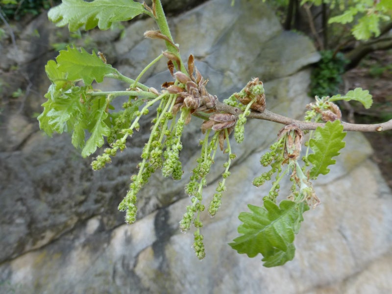 Die Eiche (Quercus sp.) kommt in Laub- und Buschwäldern bis auf 1200 m vor. Dieser Baum wird bis zu 30 m hoch, seine graubraune Rinde besitzt mehr oder weniger ausgeprägte Risse. Die meisten Arten verlieren ihr Laub im Winter, es gibt aber auch wintergrüne Arten. Die Blüten sind eingeschlechtlich: die männlichen Blüten sind in lockerblütigen Kätzchen angeordnet, die weiblichen Blüten sind einzeln oder in Gruppen zu 2-5 vereint. Unter dem Mikroskop erkennt man die Eichen-Pollenkörner mit drei schmalen, zugespitzten Keimspalten. Aus diesen Öffnungen quillt die verdickte innere Pollenwand (Intine) hervor. Die Frucht (Eichel) ist am Grund von einem Fruchtbecher umhüllt. Die Blütezeit erstreckt sich von April bis Mai. Die Pollen der Eiche werden als mäßig aggressiv eingestuft.