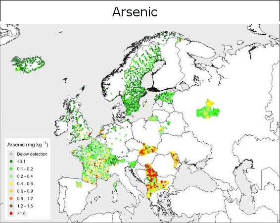 Im Westen des Landes sind -geologisch bedingt- die höchsten Konzentrationen anzutreffen. Im Median wurde bei der letzten Untersuchung (2025) eine ungefähr dieselbe Konzentration als in den Vorjahren gemessen. Im Jahr 2021 sind die medianen Arsenkonzentrationen in Südtirol ähnlich wie der europäische Mittelwert.