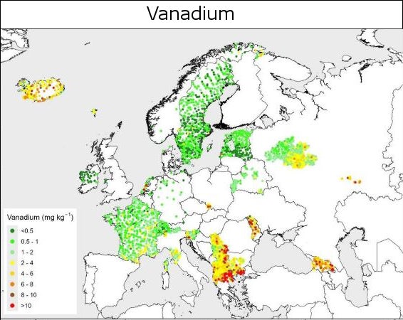 Vanadium stammt vor allem aus metallverarbeitenden Industrien, Ölraffinerien und winderodierten Böden. Dieses Element ist für bestimmte Lebewesen essentiell, in höheren Konzentrationen ist es jedoch toxisch, karzinogen und akkumulativ.