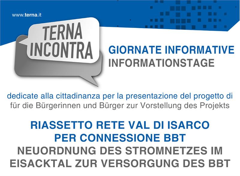 TERNA, die verantwortliche Einrichtung für Hochspannungsleitungen von nationalem Interesse, arbeitet derzeit an der Erneuerung und Modernisierung der Hochspannungsleitungen im Eisacktal. Die Bevölkerung ist zu den Treffen von 2. bis 11. Juli 2019 eingeladen, um den vorliegenden Grobentwurf zur Trassenführung gemeinsam mit TERNA zu vertiefen.