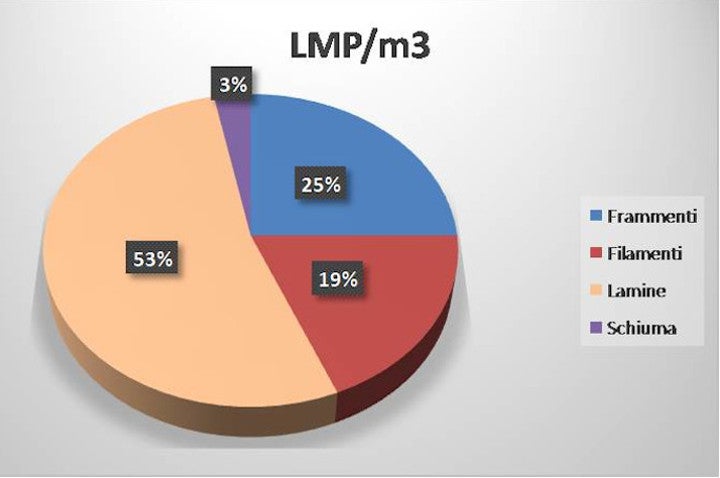 Zu Beginn der Probenahme wurde die Zählung des im Untersuchungsgebiet vorhandenen Makroplastiks durchgeführt. Diese Auswertung brachte eine beachtliche Anzahl von Objekten/Abfällen, die hauptsächlich aus Kunststoff bestanden und eine Gesamtmenge von 0,1 Objekten pro m2 ausmachten. Dabei wurde eine Gesamtkonzentration von 842,67 Mikroplastik (MP) pro m2 gefunden. Das gefundene Mikroplastik war von unterschiedlicher Form und Farbe. Dies gilt sowohl für das nach einer Vorauswahl aus dem Sediment untersuchte “Large-Microplastic” (LMP), als auch für das auf Glasfaserfiltern vorhandene “Small-Microplastic” (SMP). Wenn man die Anzahl der verschiedenen MP-Typen in den SMP-Proben genauer betrachtet (Grafik 1), erkennt man, dass die Filamente 85% der Gesamtmenge ausmachen, während in den LMP-Proben die lamellenförmigen Fragmente mit einer Konzentration von 53% überwiegen (Grafik 2).