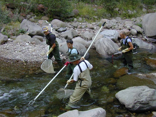 Für eine Elektroabfischung braucht es mindestens fünf Personen. Eine ist für Funktion und Kontrolle des Abfischungsgeräts verantwortlich, eine führt die Polstange, zwei sind mit Keschern ausgestattet und eine ist für den Transport der Fische in die bereitgestellten Becken zuständig.