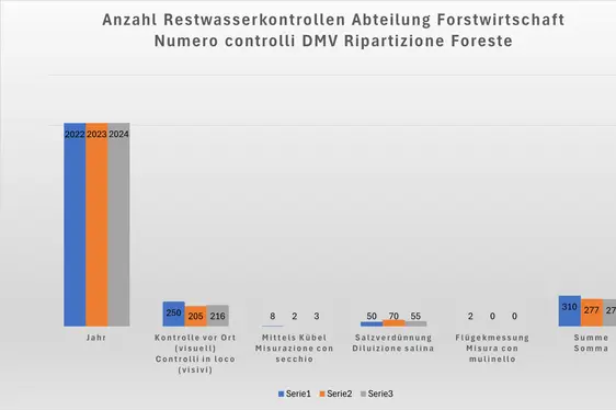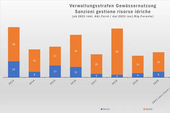 Die Anzahl der jährlich durchgeführten Kontrollen vor Ort durch die Abteilung Forstwirtschaft und die vom Amt für nachhaltige Gewässernutzung und Amt für Jagd und Fischerei ausgestellten Verwaltungsstrafen sind in folgenden Tabellen & Diagrammen dargestellt (Veröffentlichung lt. Auftrag des Südtiroler Landtags, Tagesordnung Nr. 20 zum Gesetzentwurf 114-22).